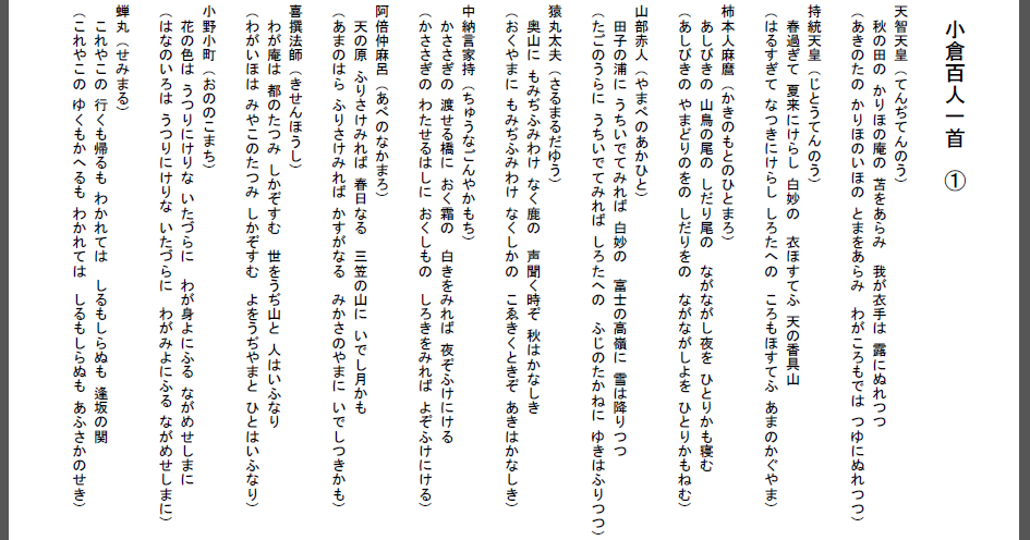 学習プリント 小倉百人一首一覧 縦書きpdf 暮らしやすく